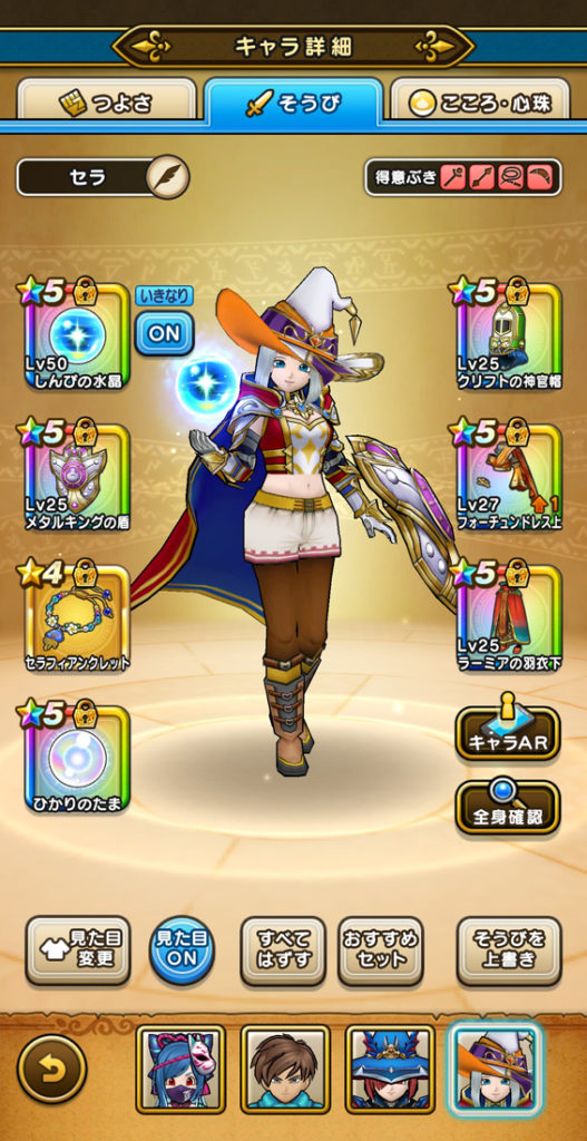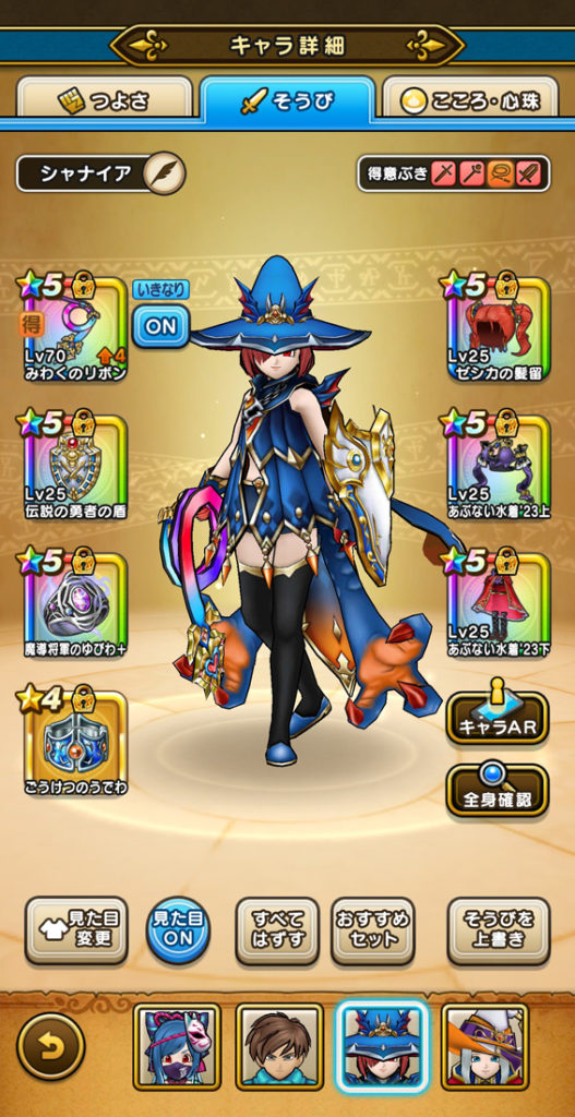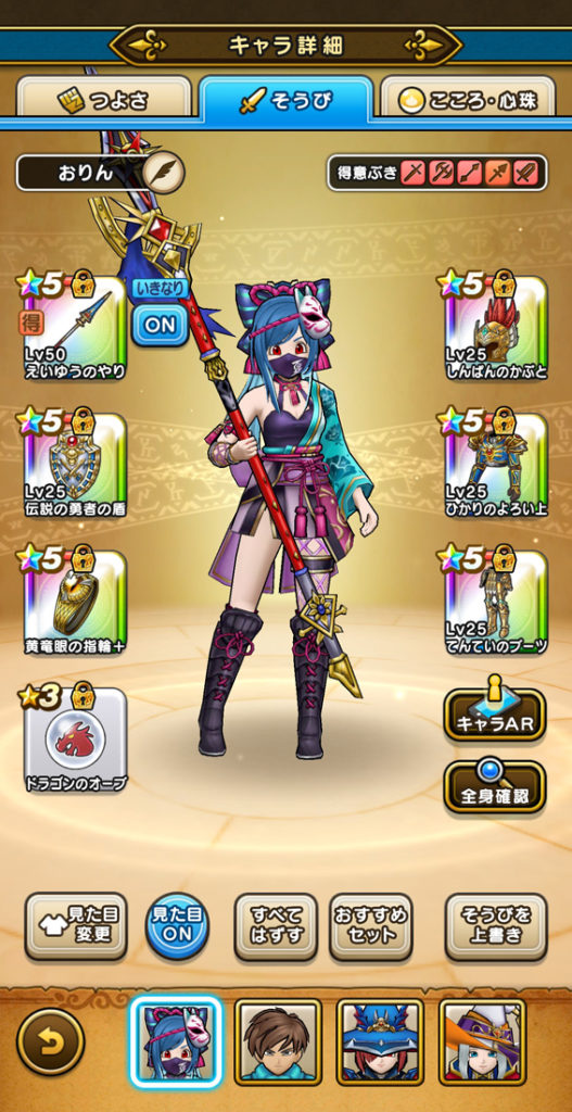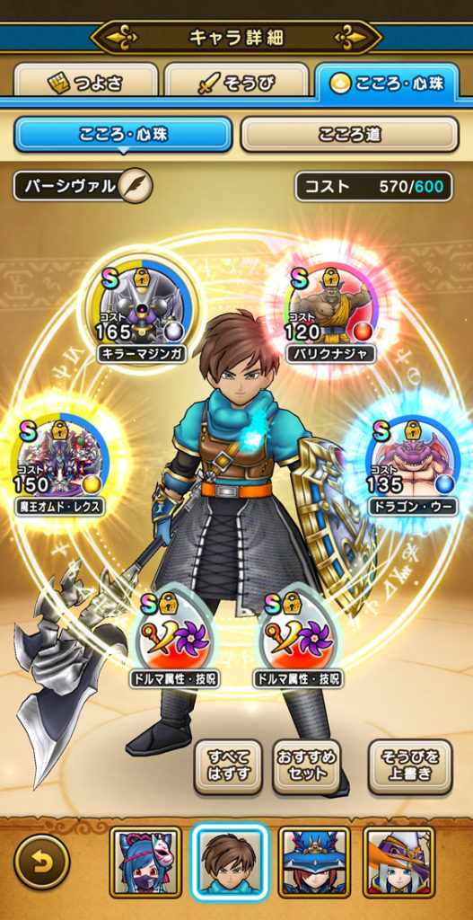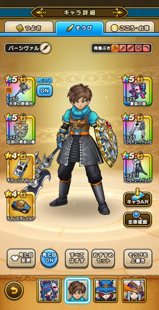 打って(みわくのリボンやら天使の断頭台やら)、守って(におうだちと回復大神官)、走る(ラッキータロットが飴玉)、スタンダードな戦い方ではあります。伝説の勇者の盾を3枚付けている時点で参考にならないかもしれませんが