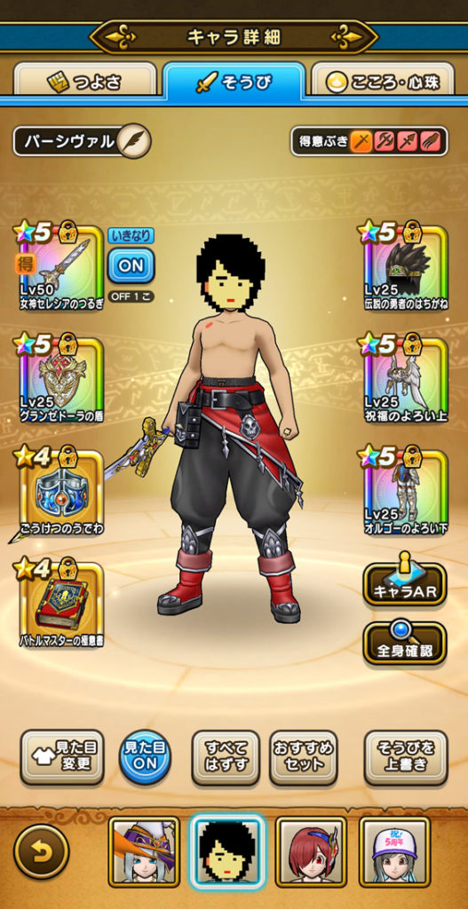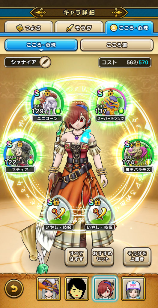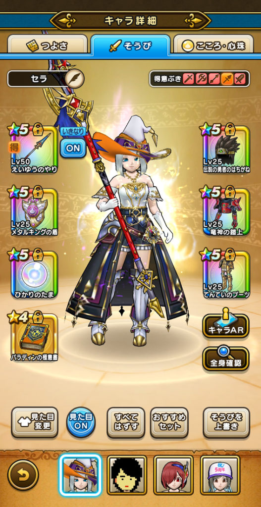 今回は火力と回復(補助)のバランスに悩みましたが、攻撃と回復を両立できる(えいゆうのやり、女神セレシアのつるぎ)編成でバランスを取るようにしました。