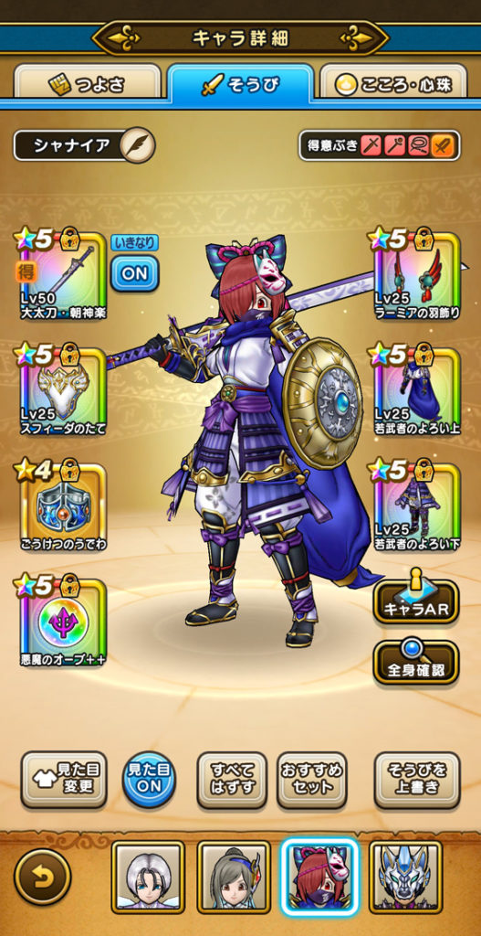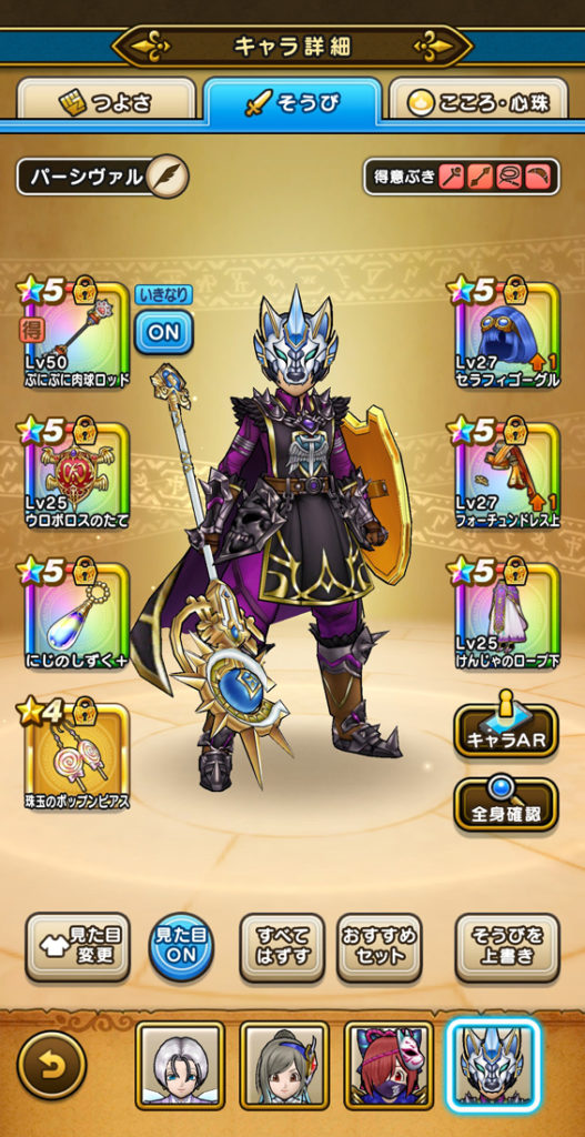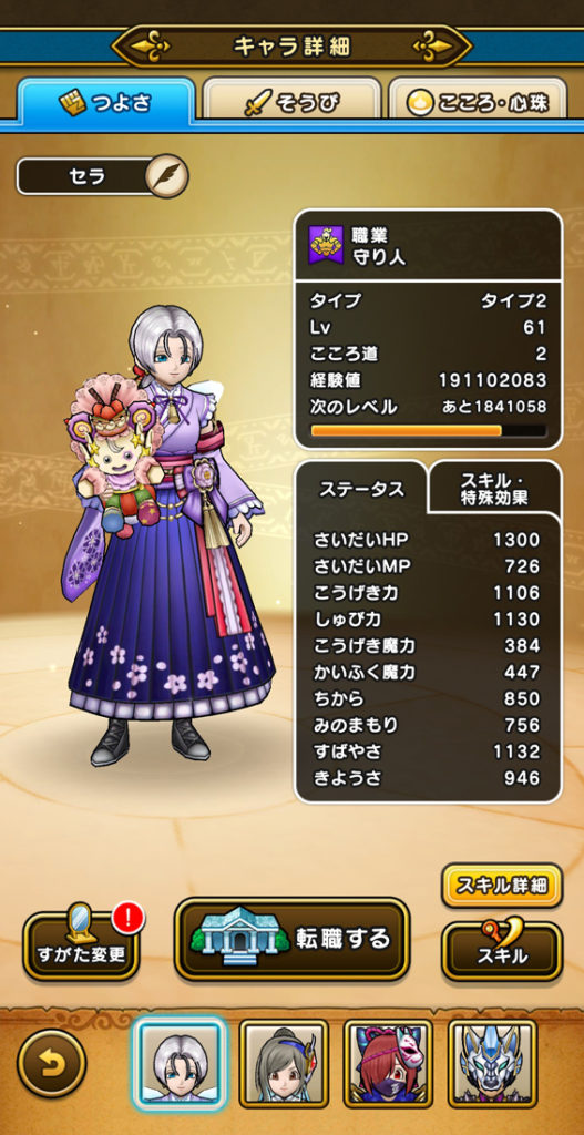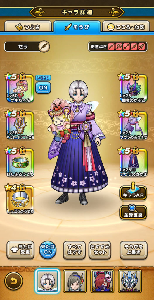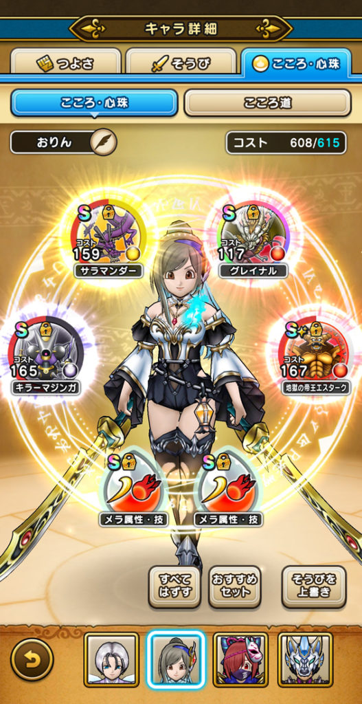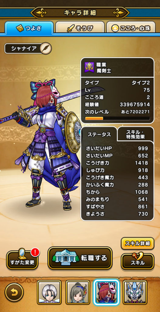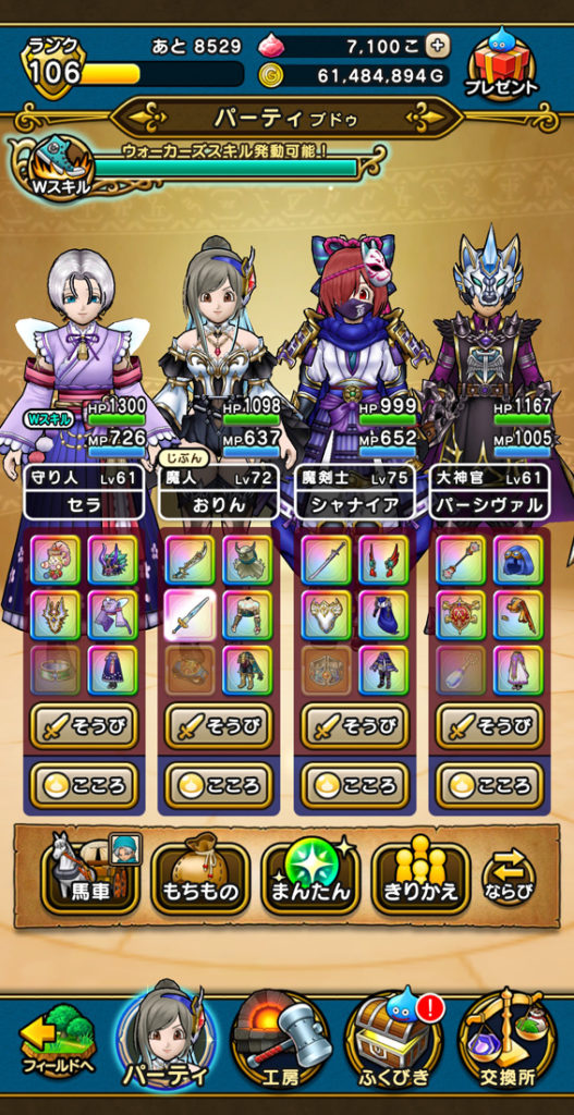 今回は、守り人(ケキちゃん)、魔人(じぶん)(エスタークの魔刃)、魔剣士(大太刀・朝神楽)、大神官(ぷにぷに肉球ロッド)の編成でプレイしています。