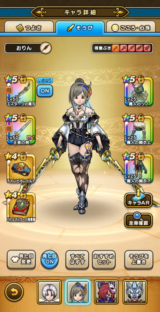 今回はバフを左隣(魔人)にかけるために片手剣として装備しています。