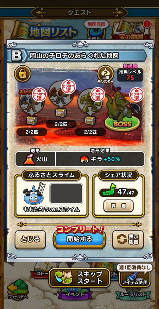 あまりよく分かっていませんが、どんなモンスターやレベルでもドロップに影響はないのではないか?と感じているため、低いレベルの宝の地図であれば、比較的ラクに規定数を回せそうな印象があります。