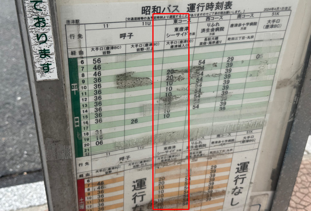 - 唐津駅からバスがでています。バスですと約10分。徒歩は約30分。